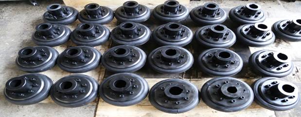 輪胎聯(lián)軸器分為凸型輪胎聯(lián)軸器和凹型輪胎聯(lián)軸器兩大類(lèi),凸型輪胎聯(lián)軸器又分為帶骨架整體式輪胎聯(lián)軸器、無(wú)骨整體式輪胎聯(lián)軸器和徑向切口式輪胎聯(lián)軸器三種。輪胎環(huán)內側用硫化方法與鋼質(zhì)骨架粘接成一體,骨架上的螺栓孔處焊有螺母。