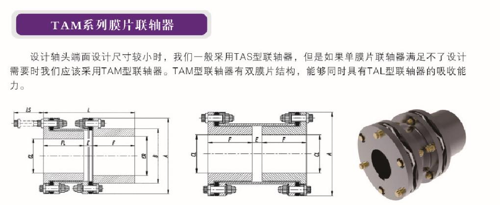 聯(lián)軸器型號 功率 / 轉速 (Kw/rpm) 公稱(chēng)扭矩 (KNm) 峰值扭矩 (KNm) *大許用轉速 (r/min) A (mm) B (mm) CL/CR max (mm) E+FL min(mm) F (mm) L(mm) LS(mm) TAM6115 0.072 0.68 2.4 15000 115 74 40/50 75 55 130 53 TAM6135 0.16 1.52......