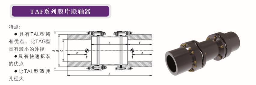 聯(lián)軸器型號 功率 / 轉速 (Kw/rpm) 公稱(chēng)扭矩 (KNm) 峰值扭矩 (KNm) *大許用轉速 (r/min) A (mm) B (mm) C(mm)max E(mm) F (mm) L(mm) TAF6115 0.072 0.68 2.4 15000 117 90 60 140 75 290 TAF6135 0.16 1.52 3.3 12000 137 113 75 140......